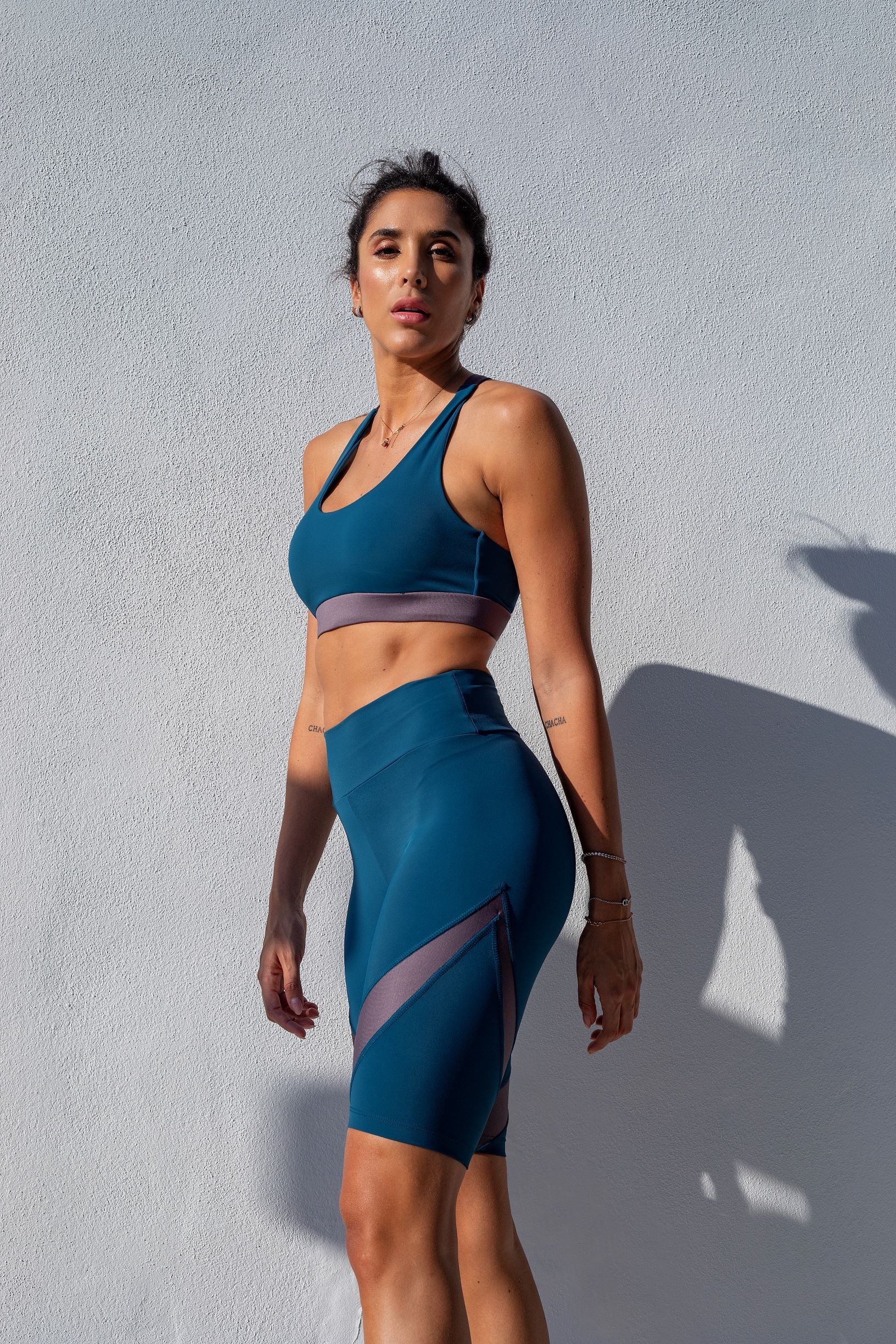 Biker with a high and anatomical waistband, with high compression, contrasting color block and hip enhancement. Cold touch fabric, with quick drying and moisture transport.