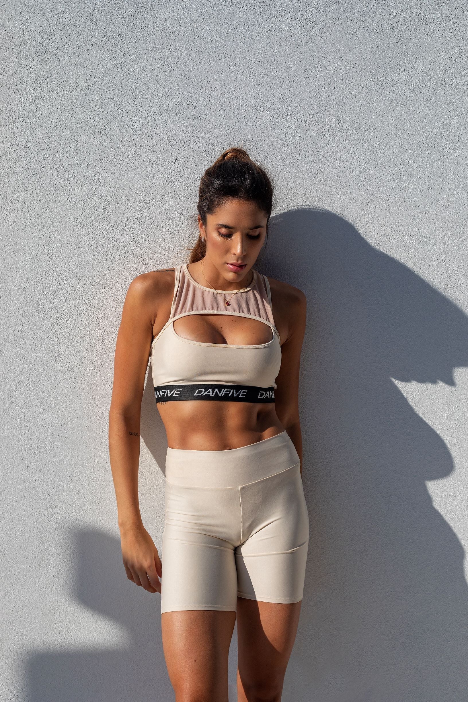 Top with round neckline, with marked elastic reinforcement, transparent bust insert in light tones. Lined for better bust support when walking, running or exercising.